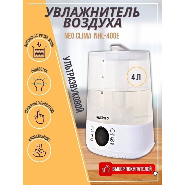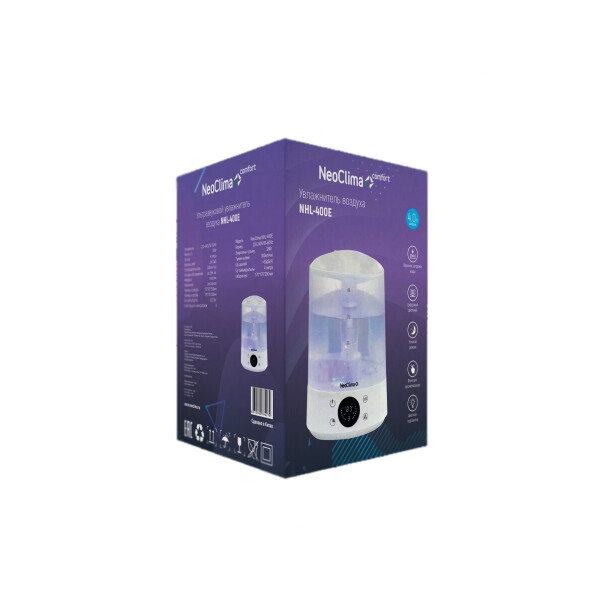 Увлажнитель воздуха ультразвуковой Neoclima NHL-400E - это бытовой прибор, который предназначен для поддержания нормального уровня влажности в помещение и создает оптимальный микроклимат в квартире или офисе. Объем бака 4 литра. Мощность 25Вт. 3 режима работы. Верхний залив воды. Вращающееся сопло. Функция ароматизации воздуха. Сенсорное управление. Гигрометр. Температура воздуха. LED подсветка (7 цветов).
