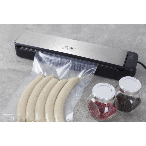 CASO VC 6 представляет собой автоматический вакуумный упаковщик. Он имеет крышку со вставкой из нержавеющей стали и отдельную кнопку запаивания. Устройство подходит для пакетов шириной 30 см, а также способен откачивать воздух из вакуумных контейнеров.