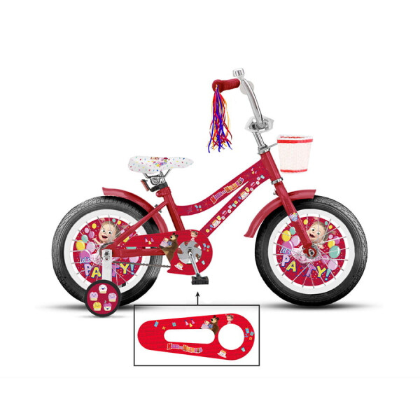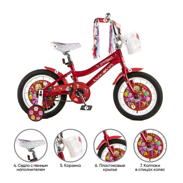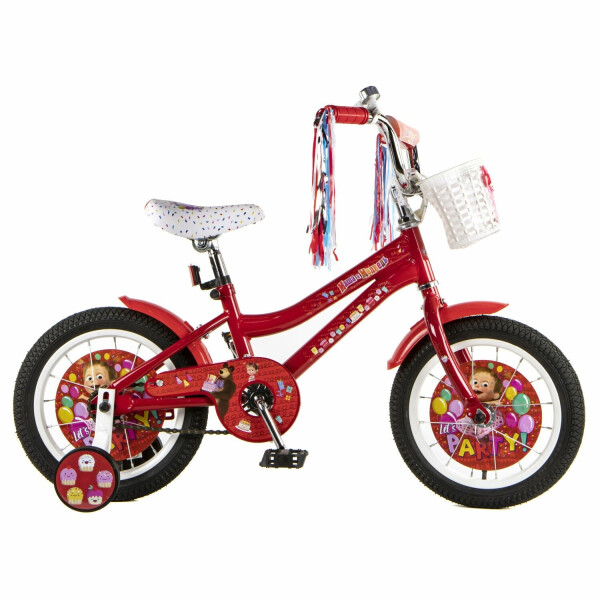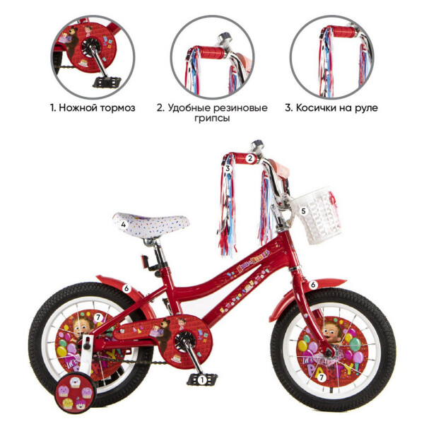 Детский велосипед, Маша и Медведь, колеса 12, стальная рама, стальные обода, ножной тормоз, защитная накладка на руле и выносе, корзина на руле, пластиковые крылья, диски-вставки в колеса с рисунком, звонок, мягкое сидение, мягкие резиновые грипсы, косички на руле, полная пластиковая защита цепи, страховочные колеса с рисунком.