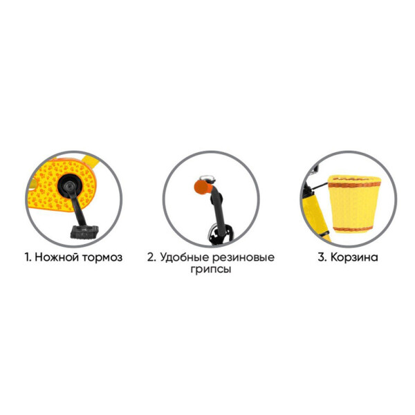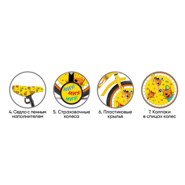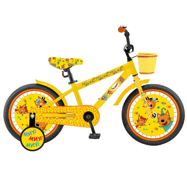 Детский велосипед, Три Кота, колеса 12, стальная рама, стальные обода, ножной тормоз, защитная накладка на руле и выносе, корзина на руле, пластиковые крылья, диски-вставки в колеса с рисунком, звонок, мягкое сидение, мягкие резиновые грипсы, полная защита цепи, страховочные колеса с рисунком.