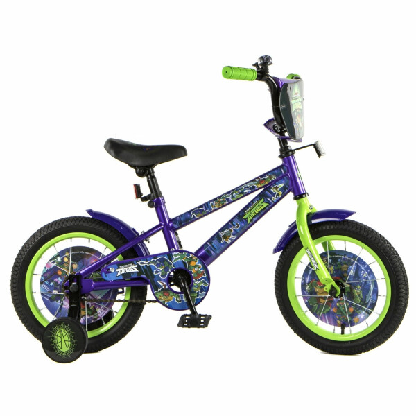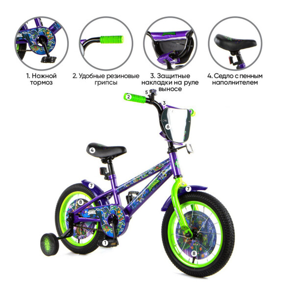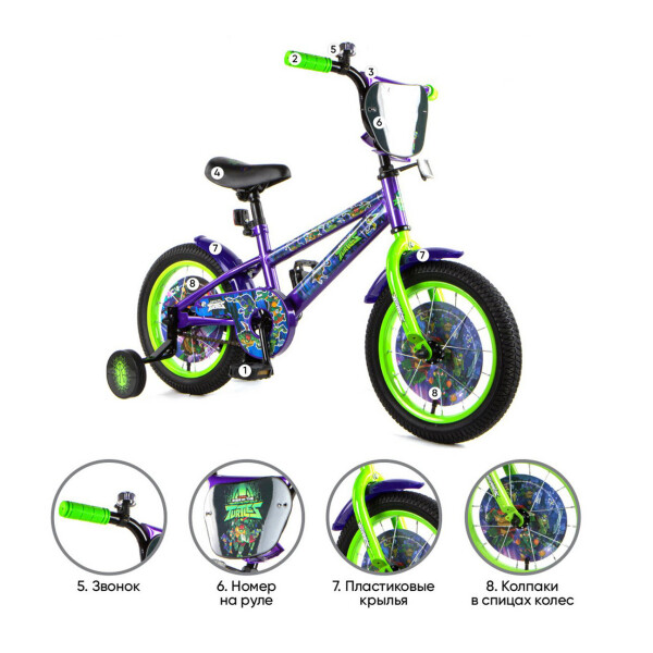 Детский велосипед Черепашки, колеса 14, стальная рама, стальные обода, ножной тормоз, защитная накладка на руле и выносе, номер на руле, пластиковые крылья, диски-вставки в колеса с рисунком, звонок, мягкое сидение, мягкие резиновые грипсы,P-образная защита цепи, страховочные колеса с рисунком.
