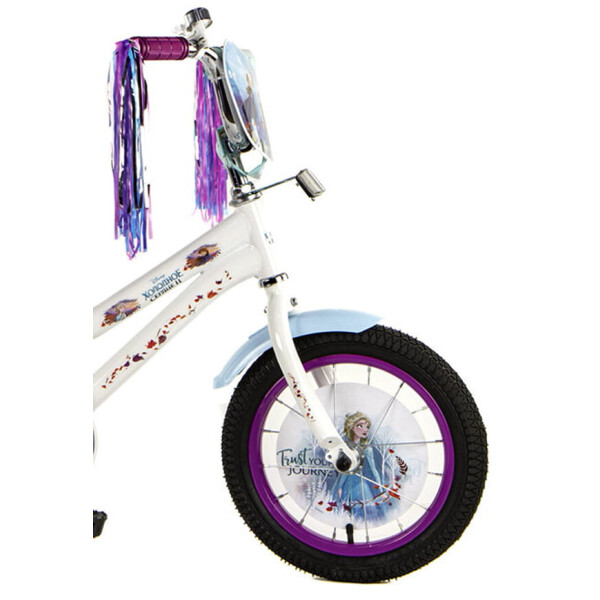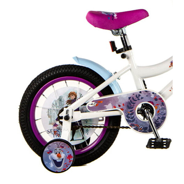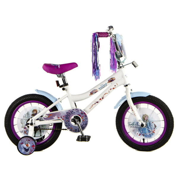 Детский велосипед, колеса 14, стальная рама, стальные обода, ножной тормоз, защитная накладка на руле и выносе, корзина на руле, пластиковые крылья, диски-вставки в колеса с рисунком, звонок, мягкое сидение, мягкие резиновые грипсы, косички на руле, полная пластиковая защита цепи, страховочные колеса с рисунком.