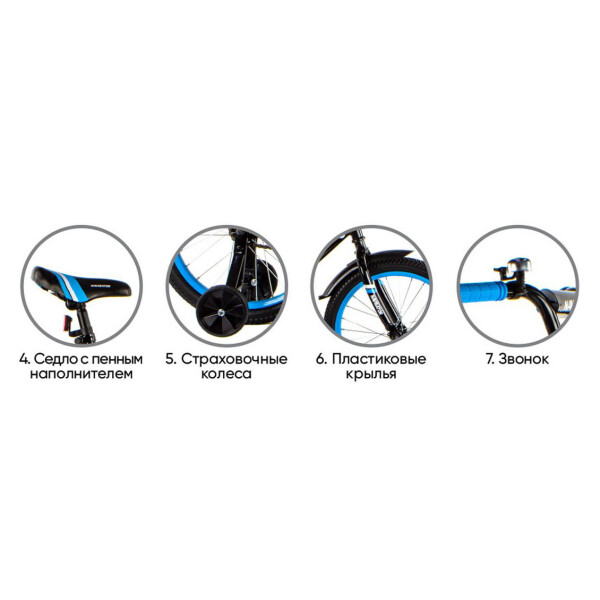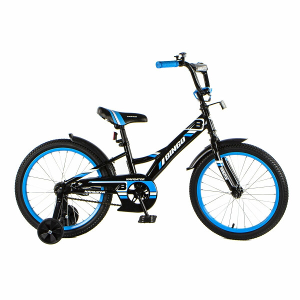 Детский велосипед, Navigator BINGO, колеса 18, стальная рама, стальные обода, ножной тормоз, мягкое седло с пеной, Z-тип защита цепи, пластиковые крылья, страховочные колеса, защитная накладка на руле и выносе.
