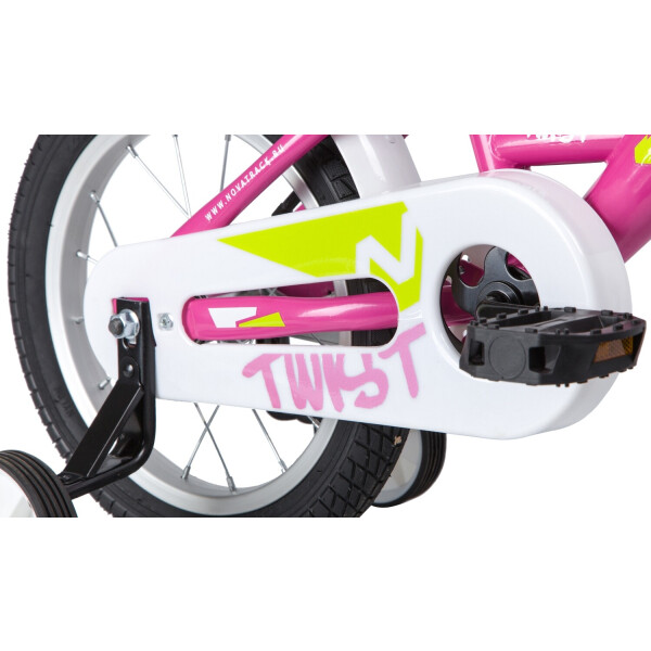 Novatrack Twist c 14-дюймовыми колесами - это надежный велосипед для детей 3-5 лет. Высокое качество сборки гарантирует, что велосипед прослужит долго, даже если ваш ребенок будет гонять на нем ежедневно по несколько часов подряд. Велосипед оснащен защитой цепи, которая не позволит ногам и одежде попасть в механизм. Еще одно средство, способствующее безопасному вождению велосипеда в любых дорожных условиях - ограничитель поворота руля, который не позволит маленькому велосипедисту слишком сильно повернуть руль и таким образом создать себе все условия для неминуемого падения. Да и учиться ездить с таким приспособлением гораздо удобнее, ведь руль не крутится вокруг своей оси, а значит и двигаться велосипед будет аккуратно и всегда именно туда, куда нужно. Колеса закрыты крыльями, которые защитят маленького наездника от грязи и брызг. Ножной тормоз позволит быстро остановиться при необходимости.