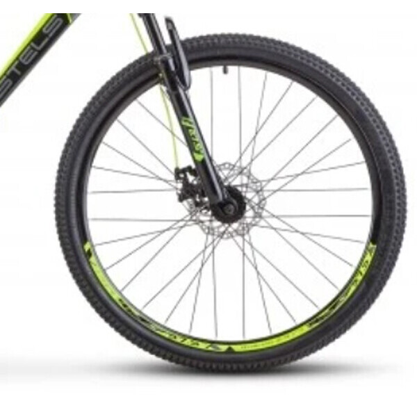 Как говорилось выше, на байк установлены увеличенные колеса. Их размер составляет 27,5 дюймов, что обеспечивает лучшее управление моделью при езде по хорошим дорогам при сравнении с байками на стандартных 26-х колесах. Кроме того, большие колеса дают возможность экономить силы при езде с постоянной скоростью. Для поддержания комфортного скоростного режима требуется прикладывать меньше усилий. На колеса надеты универсальные покрышки со средней глубиной протектора, что позволяет их использовать на асфальте и в сложных условиях, например, при проезде по грязным грунтовым участкам загородных тропинок и дорожек. Для смягчения вибраций, передающихся на руки с переднего колеса, у модели установлена стандартная амортизированная вилка пружинно-эластомерного типа. Она отлично отрабатывает незначительные неровности дорожного покрытия.