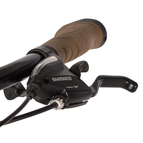 Рама выполнена в геометрии комфортной посадки и лишена верхней трубы переднего треугольника, при этом, имеет два усиления несущей трубы, а также обратите внимание на расположение крепления под дисковый тормоз на нижнем пере. Трансмиссия собрана на компонентах SHIMANO с системой на туристических звездах с размером звезд 483828 и 8-скоростной кассетой получается 24 передачи, что дает возможность двигаться не только по дорогам общего пользования с любыми уклонами, но и комфортно чувствовать себя на проселочных дорогах.
