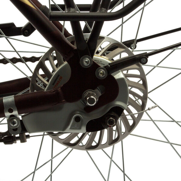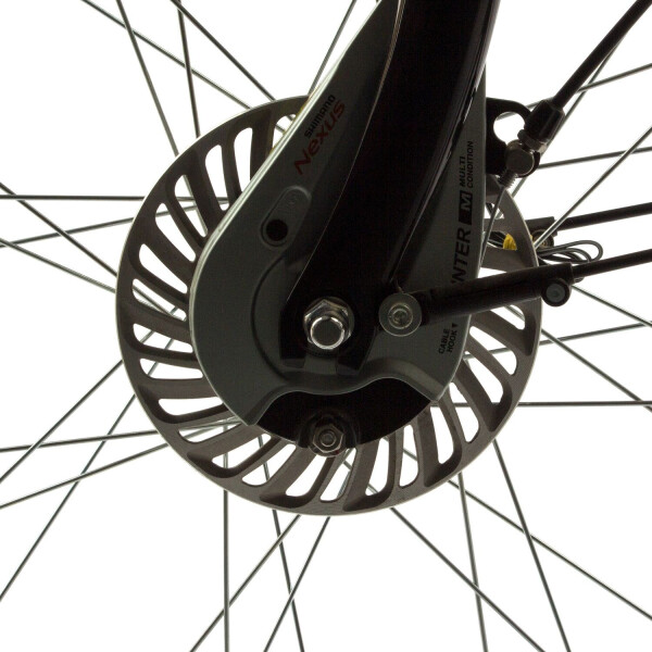 Данная модель имеет хорошее сочетание характеристик надежности и динамики. Алюминиевая рама велосипеда сделана на трубах с ребрами жесткости, а дропауты типа слайдер под регулируемое расположение тормоза. Трансмиссия велосипеда собрана на 7-скоростной планетарной втулке SHIMANO NEXUS емкостью в 306, это позволяет эффективно двигаться не только по дорогам общего пользования, но и максимально комфортно себя чувствовать на проселочных дорогах. Дисковые гидравлические тормоза универсальные - SHIMANO MT200.