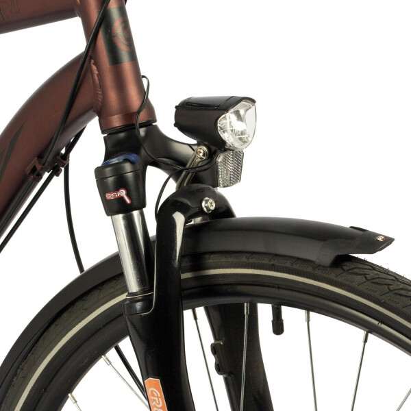 На переднем колесе установлена динамовтулка SHIMANO DYNAMO HUB, питающая переднюю и заднюю фары. Велосипед оборудован всем необходимым для городской эксплуатации полноразмерные крылья, багажник с грузоподъемностью в 25 кг, регулируемый вынос и пружинно-масляная дорожная вилка с ходом в 63 мм. Колеса собраны с использованием двойных ободов и покрышек шириной 50 мм - MITAS FLASH, что дает этой модели отличную управляемость и скоростные характеристики. Данная модель на колесах 28 дюймов с рамой 60 сантиметров в коричневом цвете.