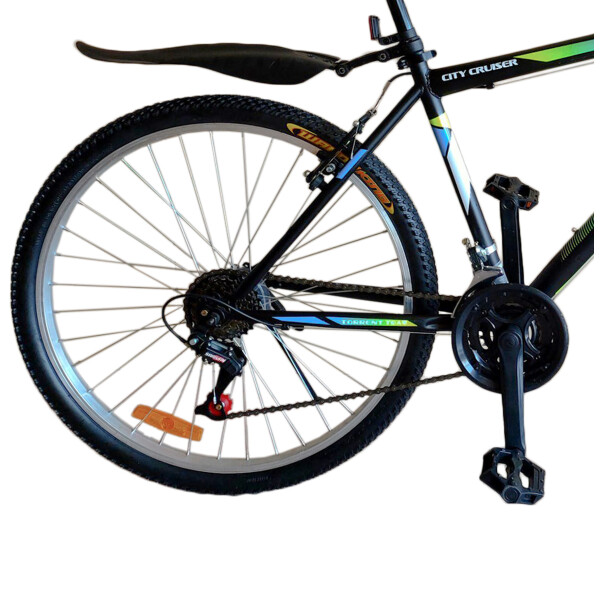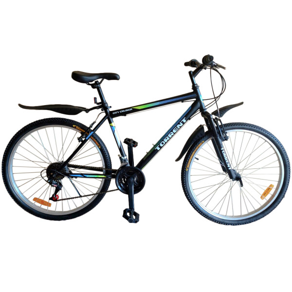 Велосипед TORRENT CITY CRUISER предназначен для подростков и взрослых с ростом до 163-179 сантиметров. Подходит для езды по выделенным городским велодорожкам, пересеченной местности, а также сельских и загородных прогулок. Рама классическая алюминиевая. Велосипед имеет такую конструкцию, которая позволяет перемещаться по дорогам со сложным рельефом (ямы, горки, пологие спуски). Комфортность езды достигается за счет гашения передним амортизатором толчков и вибраций, образующихся при столкновении колес с препятствием. Ободья алюминиевые, шины с оптимальным рисунком протектора адаптированы для езды по грунтовым дорогам и дорогам с твёрдым покрытием. Размер шин 26Х2,125. Переднее колесо быстросъемное для удобства упаковки велосипеда в багажник автомобиля или на хранение. Ширина стального руля с нанесёнными логотипами 60 сантиметров. Передний и задний тормоз V-brake обеспечивают надежное торможение. Сиденье средней мягкости с логотипом для придания спортивного стиля велосипеду регулируется по высоте. Фиксация высоты сиденья происходит с помощью ручного зажима Quick release. Длина подседельного штыря позволяет регулировать высоту сиденья до 21 сантиметра. Велосипед оборудован светоотражателями, боковым задним упором для парковки, защитой передних звёзд и пластиковыми стильными крыльями.