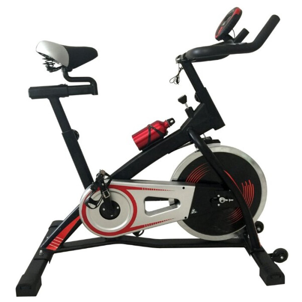 Вертикальный механический спин-байк с ременным типом привода и колодочной системой нагружения. Изменение нагрузки с помощью рукоятки на корпусе тренажера.