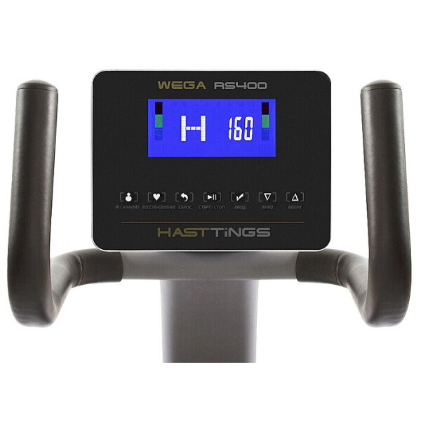Модель горизонтального велотренажера Hasttings Wega RS400 оснащается русифицированной поворотной консолью управления с цветным LCD дисплеем. Компьютер этой модели укомплектован широким набором только самых востребованных программ, среди которых имеются пульсозависимые, кардио, пользовательские режимы и т.д. Тренажер поддерживает телеметрию и может работать с основной массой встречающихся на рынке кардиопоясов.