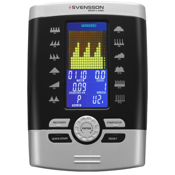 Тренировочный компьютер представлен многофункциональным цветным LCD-дисплеем диагональю 14,5 см. В программный пакет входят 12 предустановленных программ, направленных на тренировку скоростных качеств, выносливости, укрепления сердечно-сосудистой системы и похудания. Помимо предустановленных программ, можно воспользоваться самостоятельно регулируемым ручным режимом, а также создать собственную программу. Для тренировок с контролем пульса существуют 4 пульсозависимые программы с предустановленными значениями 55%, 75%, 90% и 100% от целевого максимального пульса. Эргонометрическая функция (ватты) позволяет зафиксировать необходимый уровень нагрузки – он останется постоянным вне зависимости от скорости вращения педалей. По завершении тренировки функция Recovery оценит способность сердечно-сосудистой системы к восстановлению.