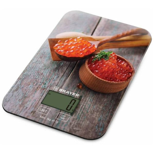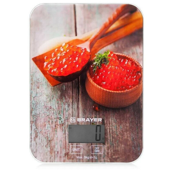 Весы кухонные Brayer BR1800 электронная модель с эффектным дизайном. Платформа весов изготовлена из стекла, а корпус из пластика. Удобное управление с помощью крупных сенсорных кнопок