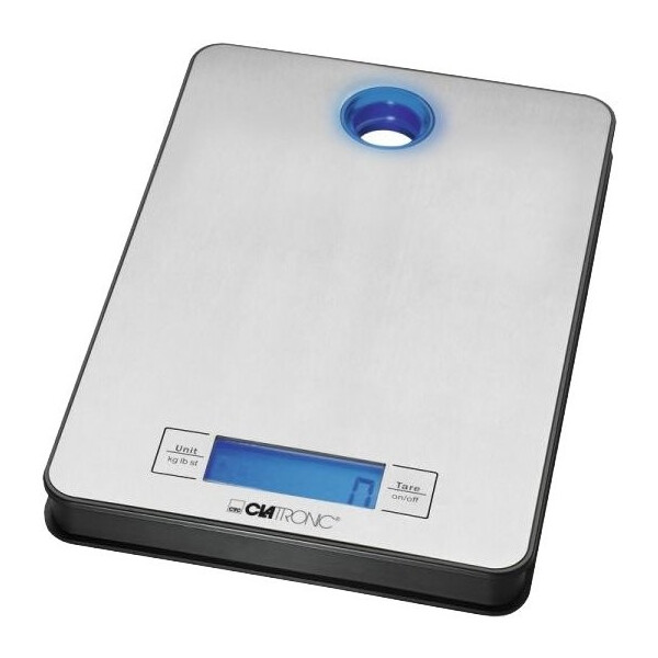 Кухонные весы Clatronic KW 3412 inox изготовлены в классическом стиле плоской формы с серебристой металлической окраской.