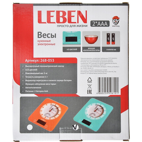 Весы кухонные LEBEN помогут вам на кухне или на даче взвесить нужное и точное количество продукта до 5 кг, весы очень удобны в применении, на табло выводятся цифры с точностью до грамма.