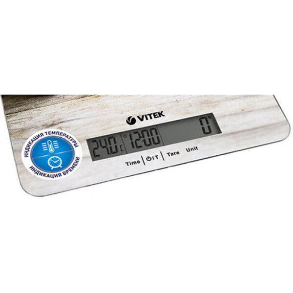 Кухонные весы Vitek VT-2429 – симпатичная электронная модель с эффектным дизайном и красивым рисунком. Модель обладает индикаторами температуры и времени. Платформа весов изготовлена из стекла, а их корпус – из пластика. Модель также может «похвастаться» сенсорным управлением и опцией автоматического выключения.