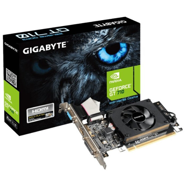 Безукоризненно исполненная и мощная видеокарта GigaByte GeForce GT 710 LP была сконструирована популярным производителем высокотехнологичной электроники GigaByte. Модель является низкопрофильной, что делает ее идеальной для установки в ультратонком корпусе. При подключении к материнской плате она займет два слота расширения. Хорошо продуманная архитектура GigaByte GeForce GT 710 LP предусматривает присутствие эффективной системы охлаждения, которая представляет собой один мощный вентилятор. Максимальное разрешение изображения, которое способен выдать порт карты, составляет 4096х2160 пикселей. При этом карта способна поддерживать два монитора одновременно.