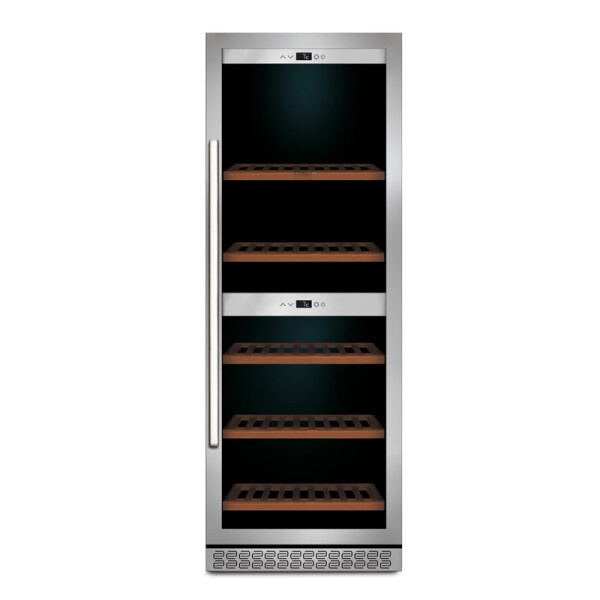 Винный шкаф WineChef Pro 126 от Caso с привлекательным дизайном позиционируется как отдельно стоящая модель. Оборудование вмещает в себя максимум 126 винных бутылок, для хранения которых выделены 2 зоны с температурным диапазоном от 5 до 20°С. Модель серебристого цвета оснащена удобными полками из дерева, светодиодной подсветкой с возможностью отключения, электронным управлением и компрессорной системой охлаждения. Сенсорное управление позволяет легко выставить нужную температуру внутри оборудования. Дверца винного шкафа оборудована двойным стеклом, а ее рама изготовлена из нержавеющей стали. Одним из преимуществ этой модели является возможность использования приложения для планшетов или смартфонов, которое позволяет контролировать управление оборудованием и просматривать статус его работы. Винный шкаф можно также приспособить для работы, встроив его в нишу.