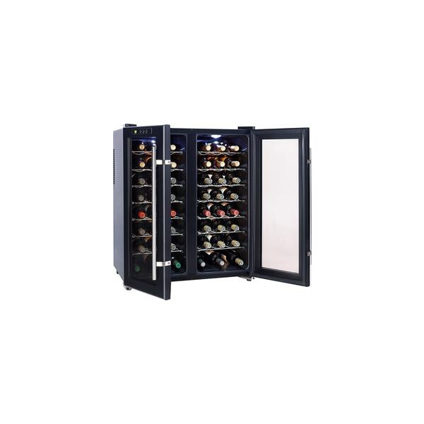 Винный шкаф Cavanova CV048-2Т спроектирован очень оригинальным образом. Несмотря на достаточно большую вместимость (48 бутылок), он занимает немного места и отлично вписывается в самые небольшие помещения. Две распашные дверцы винного холодильника упрощают доступ к вину и очень необычно дополняют интерьер. Так же одним из его достоинств является полное отсутствие шума, которое достигается благодаря системе охлаждения, основанной на принципе Пельтье. В линейке Cavanova это самый большой винный шкаф холодильник, оснащенный термоэлектрической системой охлаждения и исключающий таким образом любые вибрации. Это позволило разместить в нем металлические выдвижные полки, которые элегантно дополняют его необычный дизайн.