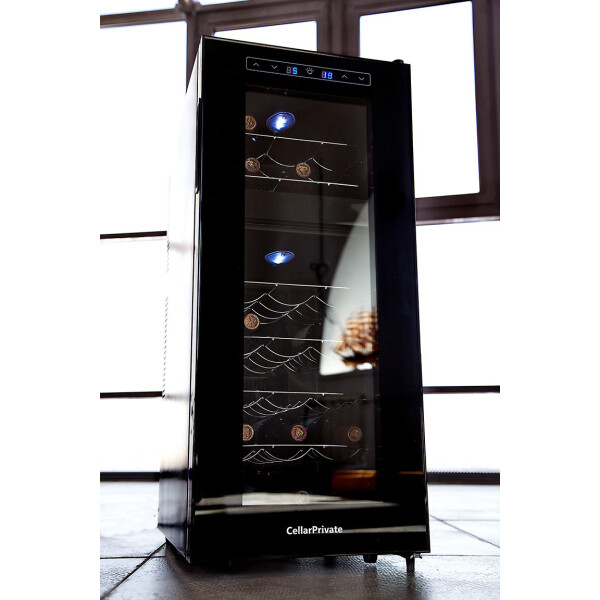 Винный шкаф CP021-2T от Cellar Private, выполненный в элегантном и динамичном дизайне, способен поддерживать два разных режима температуры. Популярная модель завоевала огромное число поклонников. Черный винный шкаф с термоэлектрической системой охлаждения и электронным управлением может вместить в себя до 21 бутылки вина. В верхней зоне этого винного шкафа температурный диапазон варьируется от 7 до 18°С, а в нижней зоне – от 11 до 18°С. В одной температурной зоне можно комфортно хранить белые вина, а в другой – красные. Модель оснащена светодиодной подсветкой, а внутри нее предусмотрены шесть металлических полок. Температура выставляется при помощи расположенного на дверце винного шкафа сенсорного экрана. В этой замечательной модели нет вибрации внутри камер, а это главное условие при содержании вин. Ценители благородного напитка, несомненно, останутся довольны всеми преимуществами этой модели винного шкафа.