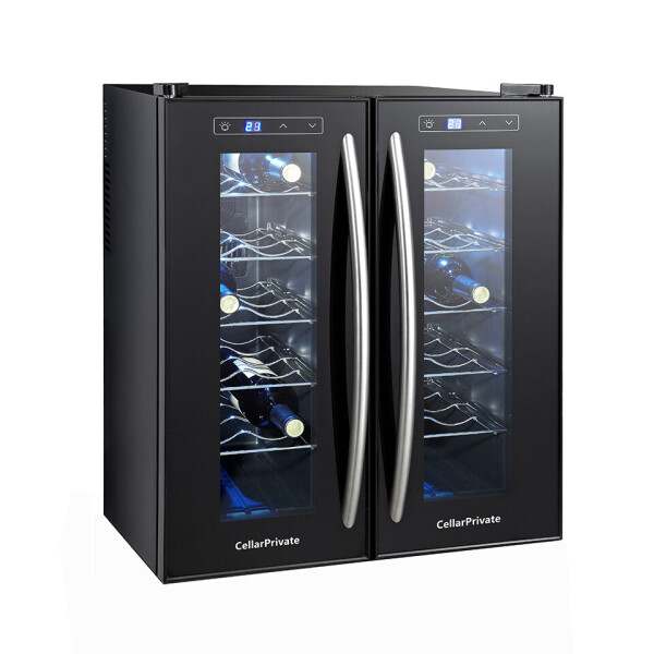 Cellar Private CP024-2T это двух камерный винный шкаф с двумя дверцами, которые открываются нараспашку. Вместимость до 24 бутылок. Температура выставляется в каждой камере раздельно, что позволяет хранить одновременно красные и белые вина.