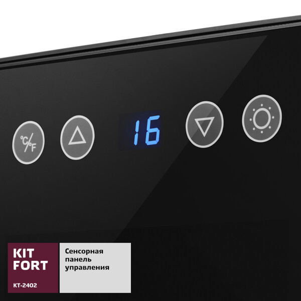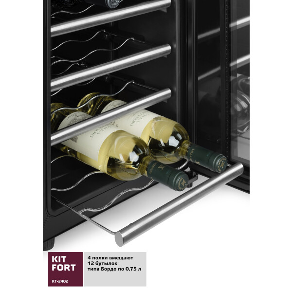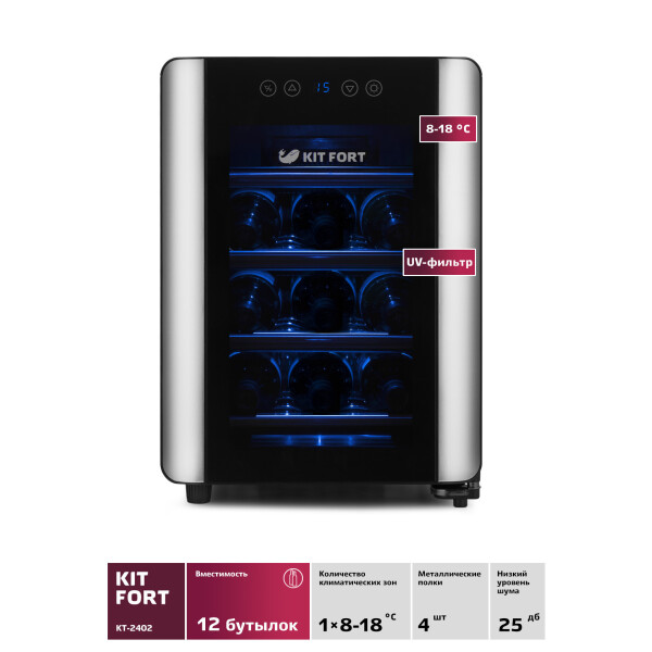 Винный шкаф Kitfort KT-2402 — это холодильник для хранения вина в бутылках. В винном шкафу имеются двенадцать лотков для укладки бутылок, расположенных на съемных полках. Дверца шкафа прозрачная, в ее верхней части расположена сенсорная панель управления со светодиодным дисплеем. Охлаждение производится при помощи термоэлементов Пельтье, поэтому в винном шкафу не используется никаких вредных хладагентов, а уровень шума меньше, чем у компрессорных холодильников, и отсутствуют вибрации. Рабочий температурный диапазон винного шкафа выставляется в пределах от 8 °С до 18 °С с шагом в 1 °С.