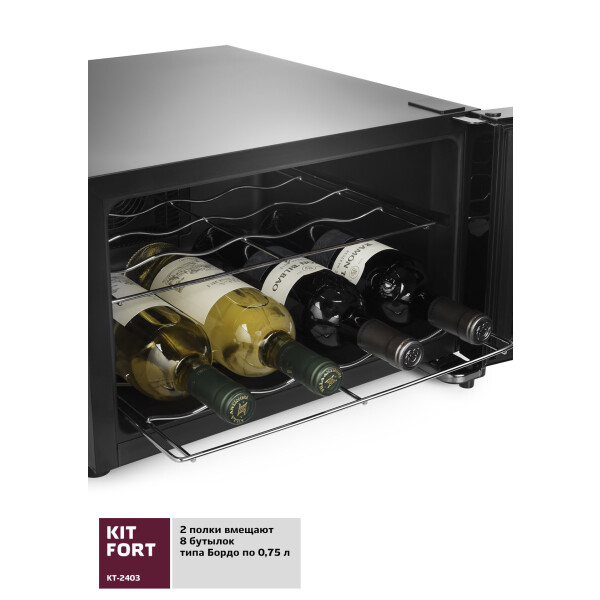 Винный шкаф Kitfort KT-2403 — это холодильник для хранения вина в бутылках. В винном шкафу имеются восемь лотков для укладки бутылок, расположенных на двух полках. Дверца шкафа прозрачная, в ее верхней части расположена сенсорная панель управления со светодиодным дисплеем. Охлаждение производится при помощи термоэлементов Пельтье, поэтому в винном шкафу не используется никаких вредных хладагентов, а уровень шума меньше, чем у компрессорных холодильников, и отсутствуют вибрации. Рабочий температурный диапазон винного шкафа выставляется в пределах от 8 °С до 18 °С с шагом в 1 °С.