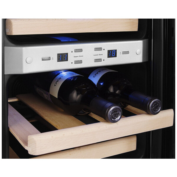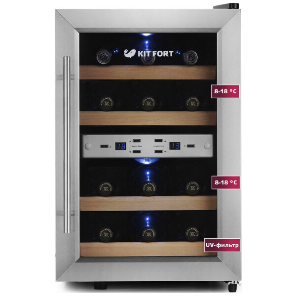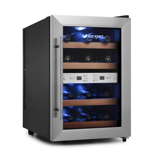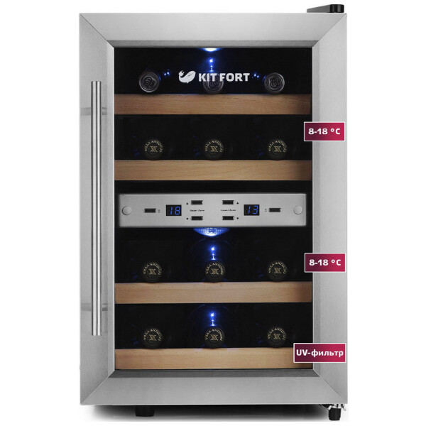 Винный шкаф Kitfort КТ-2404 имеет 2 температурные зоны, в каждой из которых возможно выставить индивидуальный температурный режим хранения. В винном шкафу имеются 4 деревянные полки для укладки бутылок. Рабочий температурный диапазон винного шкафа выставляется в пределах от 8 °С до 18 °С, температура настраивается с шагом в 1 °С.