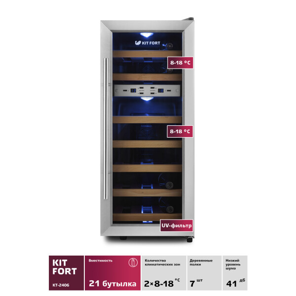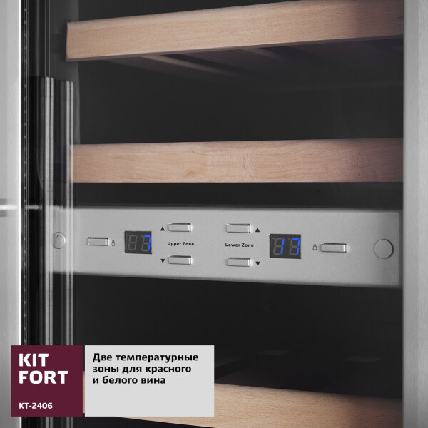 Винный шкаф Kitfort KT-2406 состоит из двух камер, в каждой из которых возможно выставить индивидуальный температурный режим хранения. В верхнюю камеру помещается 6 бутылок, в нижнюю — 15 бутылок. Охлаждение производится при помощи термоэлементов Пельтье, поэтому в винном шкафу не используется никаких вредных хладагентов, а уровень шума меньше, чем у компрессорных холодильников, и отсутствуют вибрации. Рабочий температурный диапазон винного шкафа выставляется в пределах от 7 °С до 18 °С для верхней камеры, и от 10 °С до 18 °С для нижней камеры; температура настраивается с шагом в 1 °С.