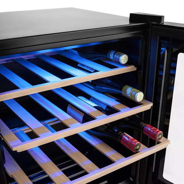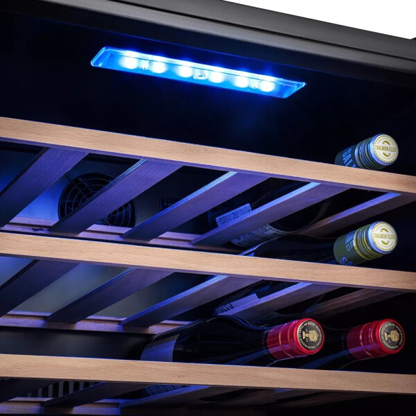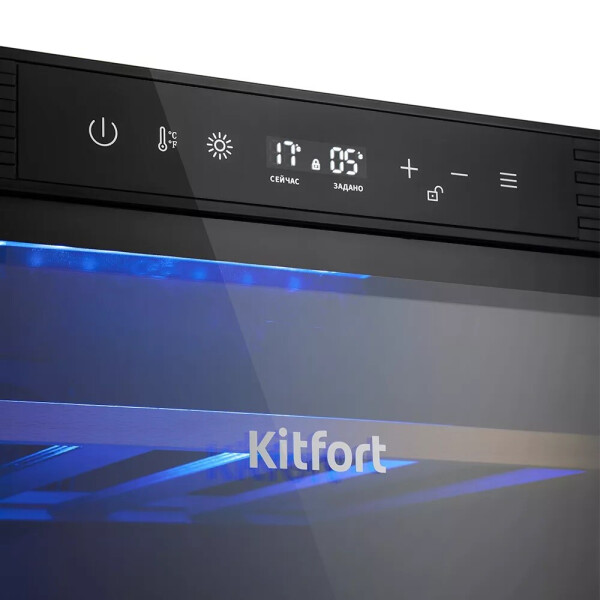 Лампы подсветки светят неярким синим светом, чтобы исключить его воздействие на бутылки с вином. Так что вы можете хранить вино даже в прозрачных бутылках. Всё управление расположено дверце шкафа.