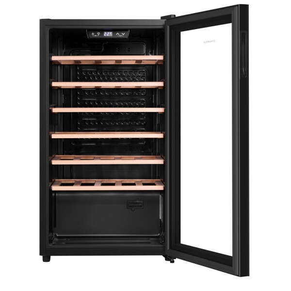Изысканный дизайн модели делает её абсолютным выбором большинства: корпус выполнен из металла, окрашенной в чёрный цвет. Современная технология освещения зоны позволит вам в любое время эффектно продемонстрировать вашу винную коллекцию гостям. Каждая деталь модели гармонично дополняет друг друга, делая винный шкаф универсальным под любые стили интерьера.