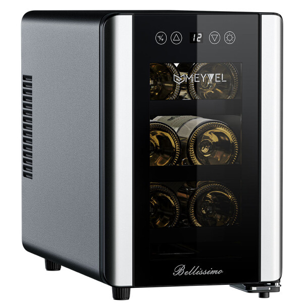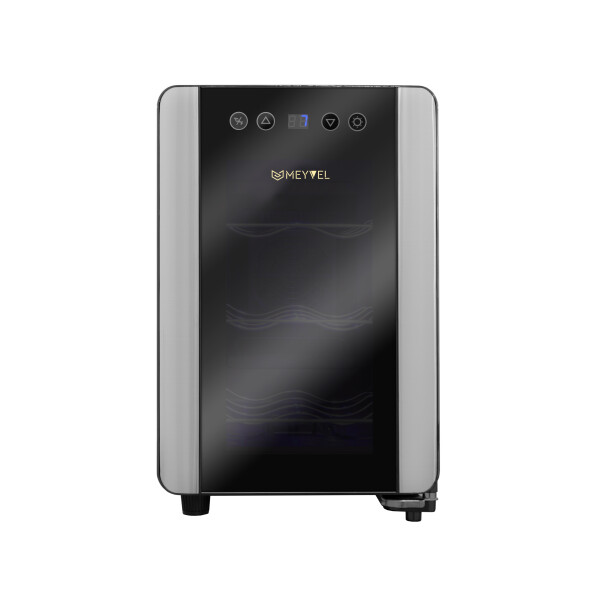 Винный шкаф MEYVEL (Мейвел) MV06-BSF1 (easy) небольших размеров с корпусом из стали черного цвета и стильной дверцей гармонично впишется в любой интерьер. Рамка из стали по обеим сторонам дверцы придает оригинальности данной модели. Возможность выставить необходимую температура в винном шкафу позволяет хранить в нем разные сорта вин.