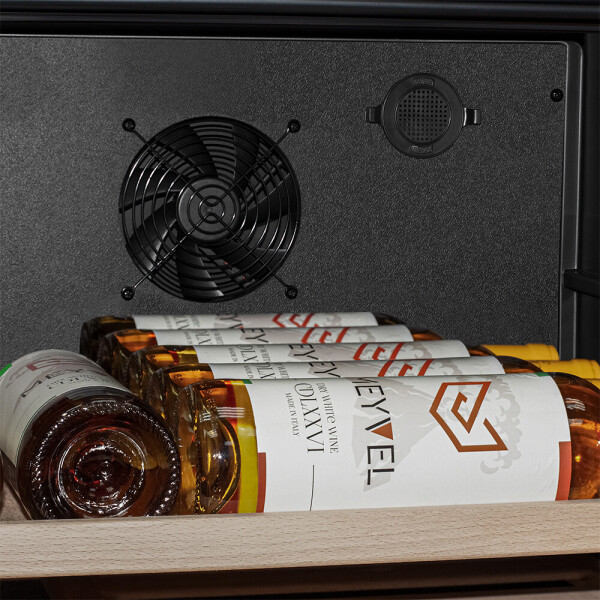 Винный шкаф предназначен для профессионального и длительного хранения различных сортов вин (до 110 бутылок типа Бордо). Он так же оснащен дверью с защитой от ультрафиолетовых лучей и поддерживает влажность в диапазоне 60-80%, как в настоящем винном погребе.