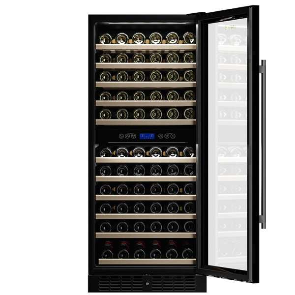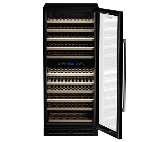 Компрессорный винный шкаф Meyvel MV116-KBT2 обладает большой вместимостью и способен разместить до 116 бутылок. Располагаются они на полках из массива бука. Внутреннее пространство шкафа разделено на 2 температурные зоны с возможностью настраивать каждую из них: диапазон нижней зоны от +10C до +18C, а верхней - от + 5C до +10C. Холодильник поддерживает влажность в диапазоне 60-80%, как в настоящем винном погребе.