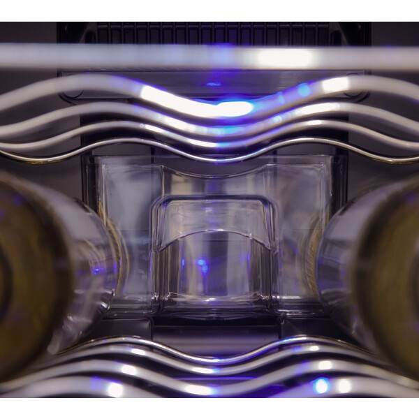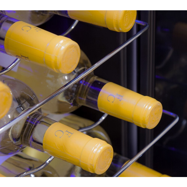 Двойное стекло с защитой от прямых УФ-лучей поддерживает качественные условия хранения вина. Для размещения винных бутылок, шкаф оснащен 4 полками из хромированного металла.