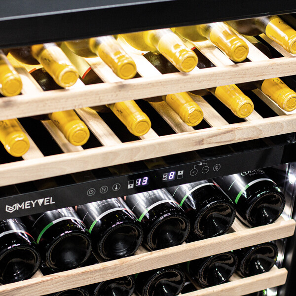 Компрессорный винный шкаф Meyvel MV46PRO-KBT2 обладает большой вместимостью и даёт возможность разместить до 46 бутылок стандартного типа Бордо (0,75 л). Располагаются они на выкатных полках из дерева.