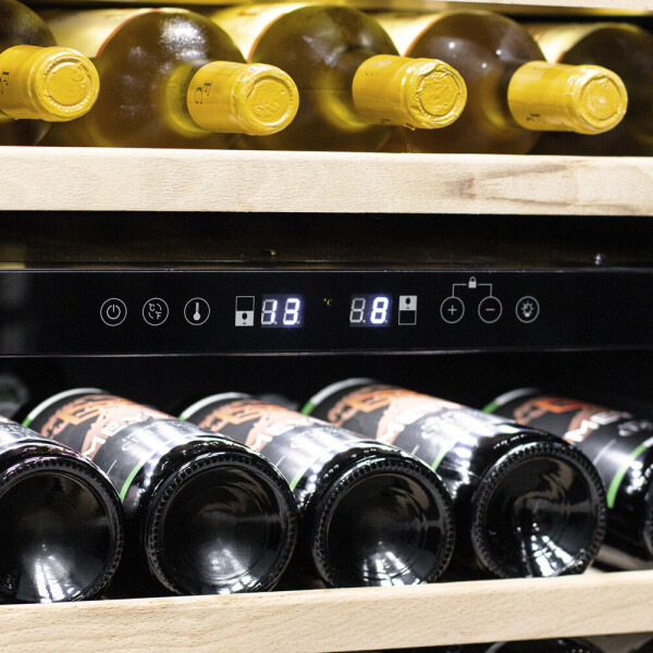 Внутреннее пространство шкафа разделено на 2 температурные зоны, с возможностью настраивать каждую из них. Диапазон верхней зоны варьируется от +5C до +12C, а нижней - от +12C до +20C.