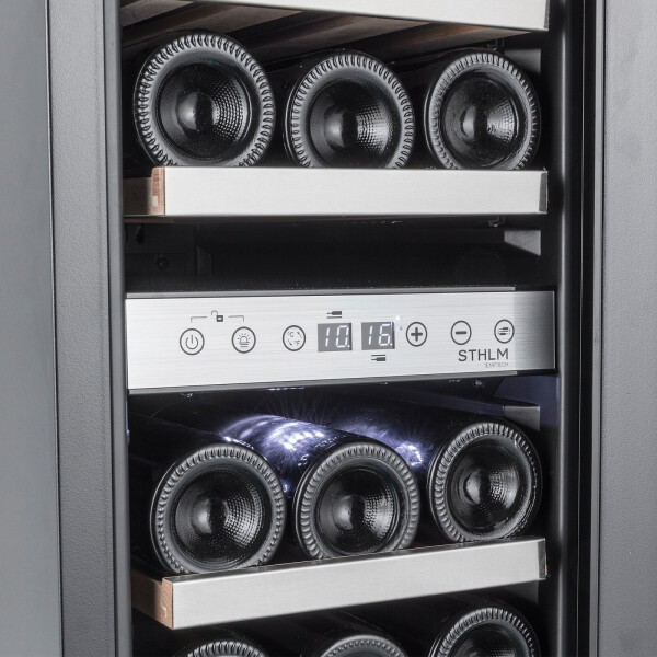 Винный шкаф Temptech STHLM STX30DRB предназначен для охлаждения, хранения и демонстрации бутилированного вина. Модель оснащена сенсорной панелью с дисплеем для регулировки температуры и освещения, 5 выдвижными полками, дверцей со встроенной ручкой и белой светодиодной подсветкой. Дверца выполнена из трехслойного стекла с защитой от УФ-лучей, передняя панель - из черного стекла, полки - из необработанного бука с деталями из нержавеющей стали.