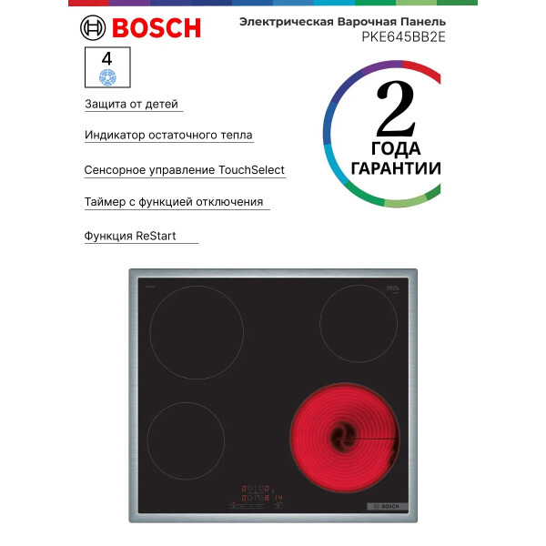 Электрическая варочная панель Bosch PKE645BB2E имеет 17 уровней мощности, что позволяет выбрать оптимальную интенсивность нагрева в зависимости от рецептуры. Четыре конфорки обеспечивают равномерное распределение тепла. Для управления и активации дополнительных функций используются сенсорные переключатели. Устройство поддерживает опцию ReStart, которая при непредвиденном отключении сохраняет ранее заданные настройки. Индикатор остаточного тепла погаснет, когда конфорка остынет. Это создает безопасные условия в процессе эксплуатации.