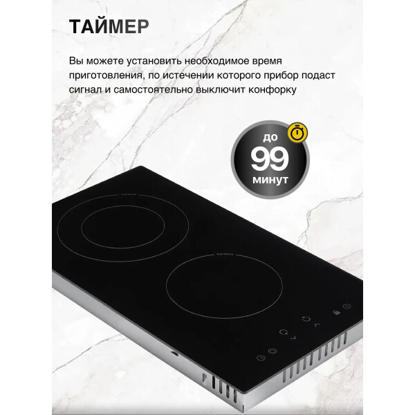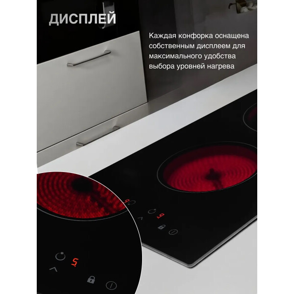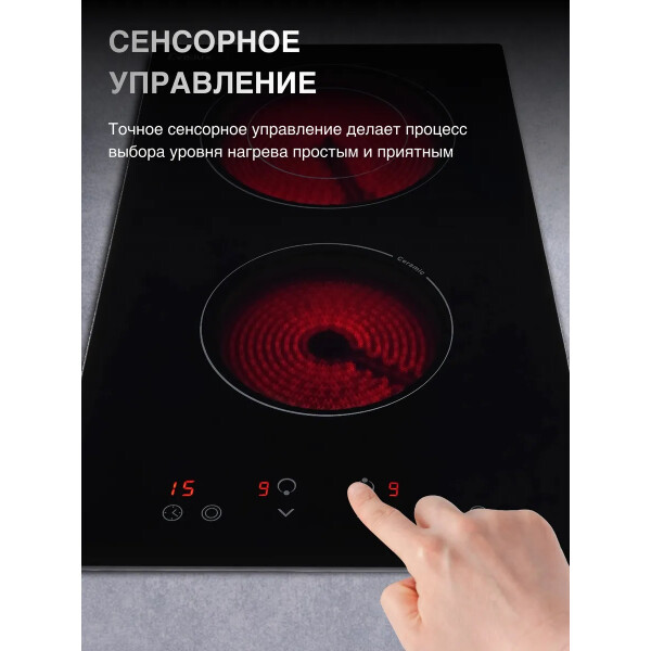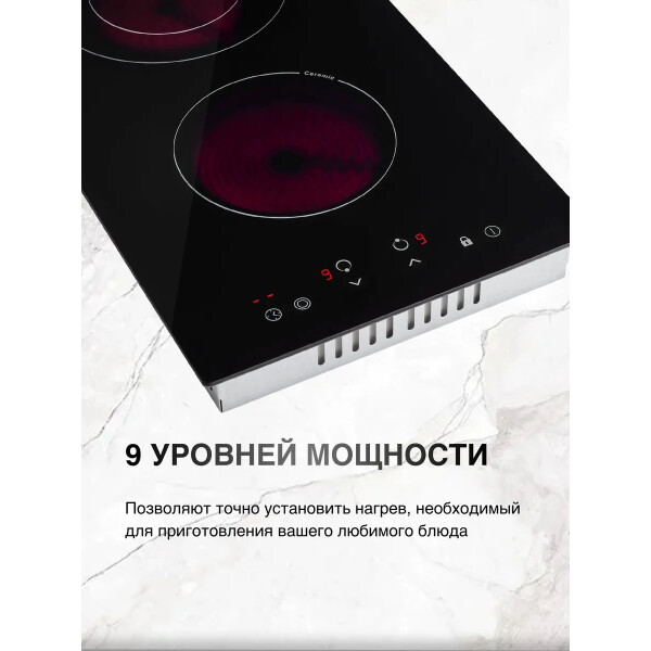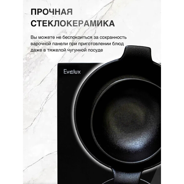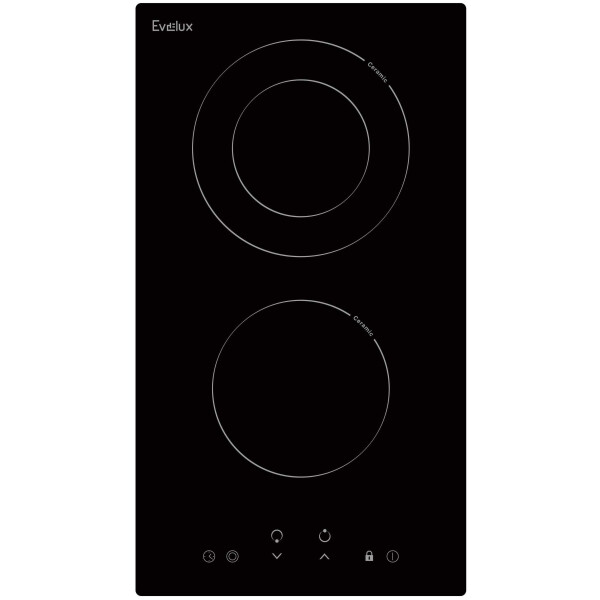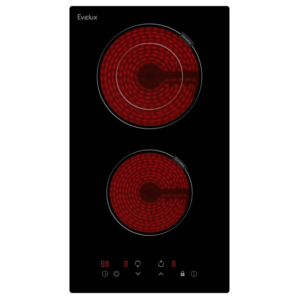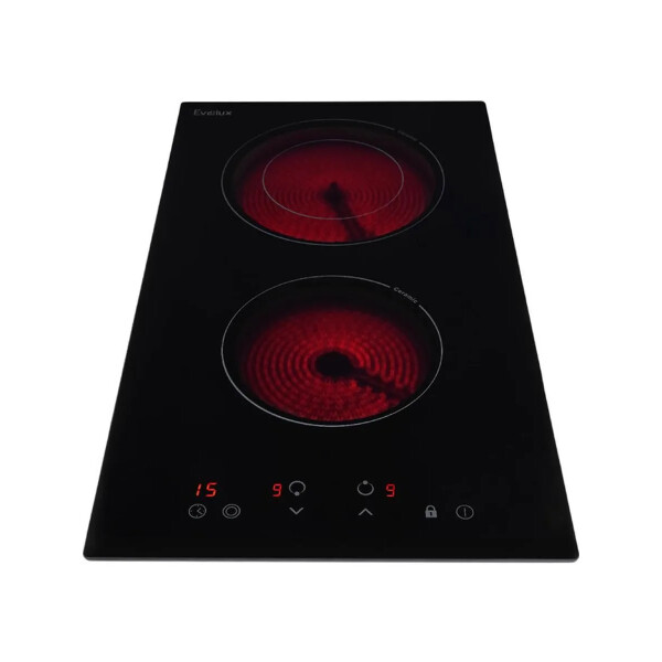 Электрическая варочная поверхность Evelux предполагает наличие 2 конфорок, которые расположены на компактной встраиваемой панели размером 29x52 см. Каждая из зон нагрева диаметром 16.5 и 20 см оснащена индикаторами остаточного тепла. После их угасания вы точно будете знать, что стеклокерамической поверхности безопасно касаться. При этом конфорки дополнены опцией экспресс-нагрева: вам не придется ждать, если к готовке нужно приступить быстро.