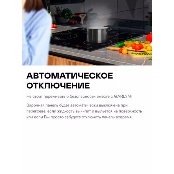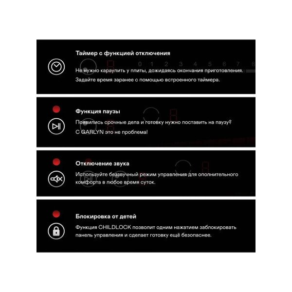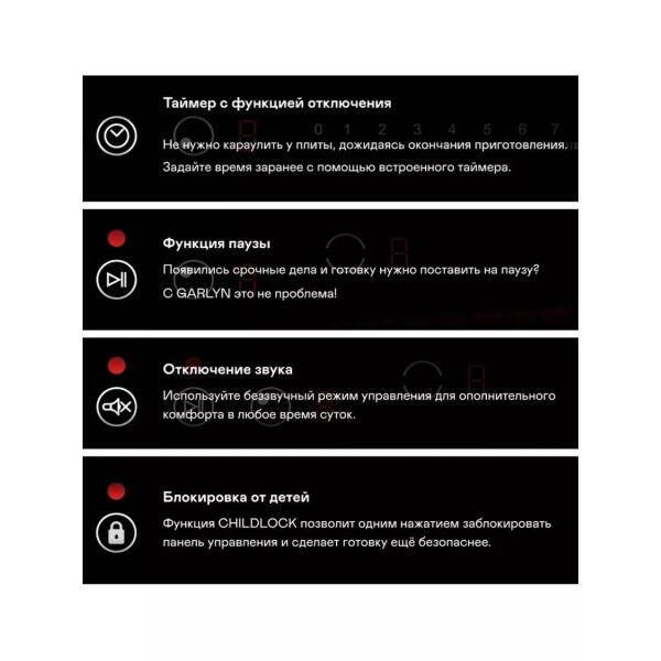 Варочная панель будет автоматически выключена при перегреве, если жидкость выкипит и выльется на поверхность или если вы просто забудете отключить панель вовремя. Таймер с функцией отключения.