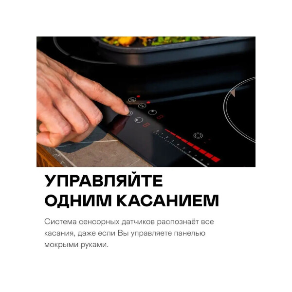 Настраивайте мощность одним касанием или лёгким движением по шкале. Система сенсорных датчиков распознаёт все касания, даже если Вы управляете панелью мокрыми руками.