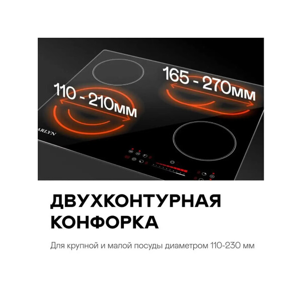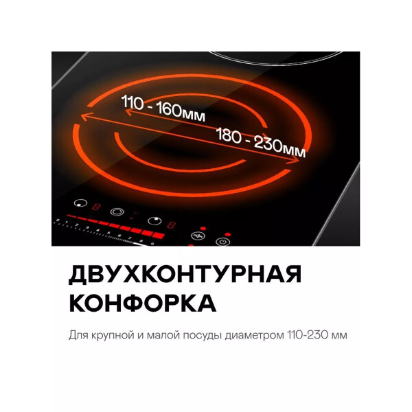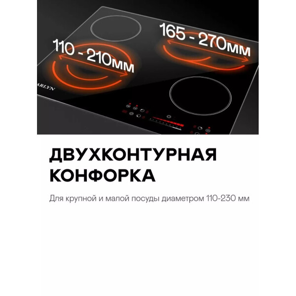 2 двухконтурных конфорки. Для крупной и малогабаритной посуды диаметром от 110 до 270 мм.