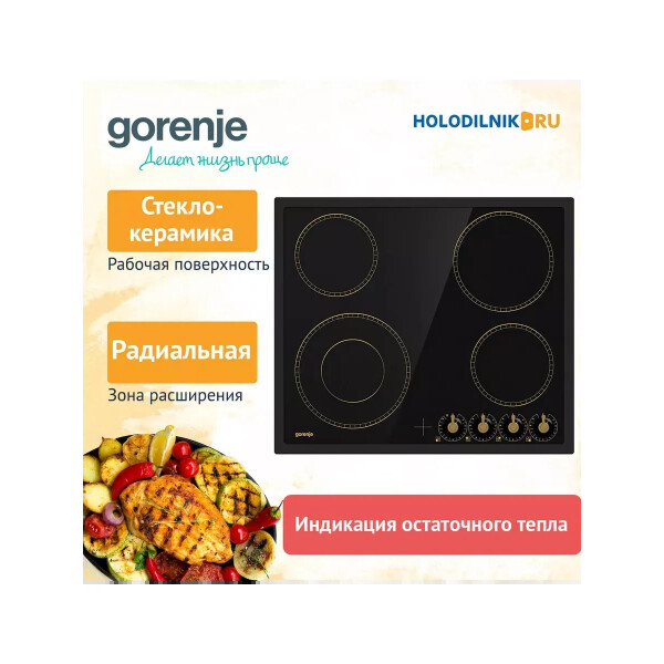 Независимая стеклокерамическая поверхность Gorenje EC642CLB пополнила коллекцию Classico. Характерный узор обрамляет варочные зоны, панель управления представлена поворотными ручками в винтажном стиле. Индикатор остаточного тепла показывает, что конфорка еще не остыла и ее можно использовать для разогрева блюд, растапливания масла или шоколада.