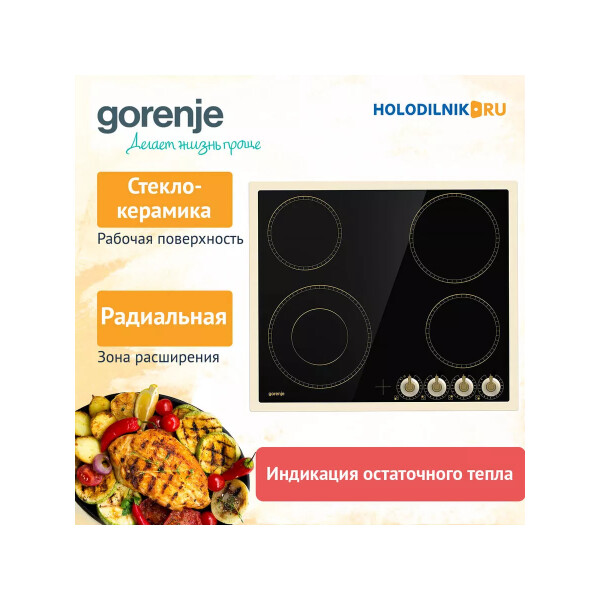 Независимая стеклокерамическая поверхность Gorenje EC642CLB пополнила коллекцию Classico. Характерный узор обрамляет варочные зоны, панель управления представлена поворотными ручками в винтажном стиле. Индикатор остаточного тепла показывает, что конфорка еще не остыла и ее можно использовать для разогрева блюд, растапливания масла или шоколада.