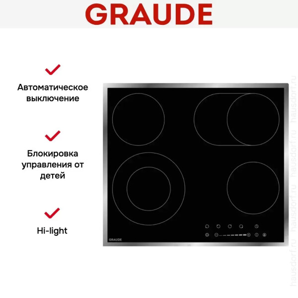 Варочная панель Graude EK 60.2 E оснащена индикатором остаточного тепла, который показывает, что конфорка еще не остыла и прикасаться к ней нельзя. Конфорки с круглой и овальной зонами расширения позволяют готовить в посуде разного диаметра и формы. Блокировка от детей делает данную модель безопасной.