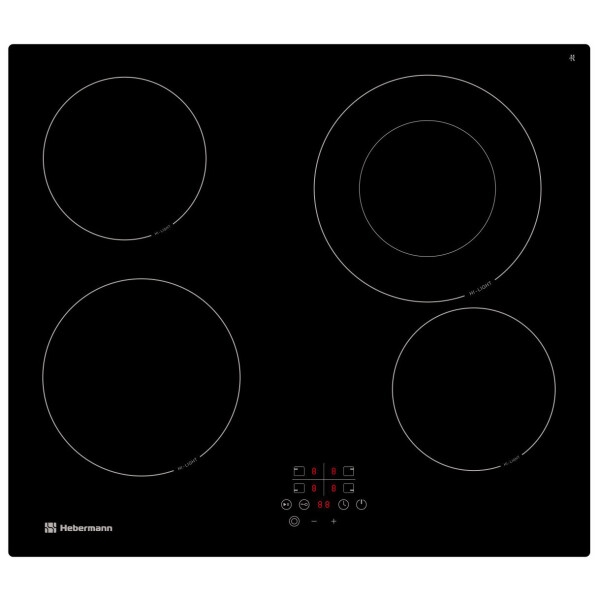 Электрическая варочная панель Hebermann имеет специальную конструкцию, посредством которой может встраиваться в кухонный гарнитур. Модель позволяет готовить несколько блюд одновременно, так как оснащена четырьмя конфорками типа Hi-Light. Благодаря высокой мощности устройство позволяет вскипятить воду или разогреть пищу за несколько минут. На передней части корпуса расположена сенсорная панель управления, при помощи которой можно выбрать необходимый режим работы.