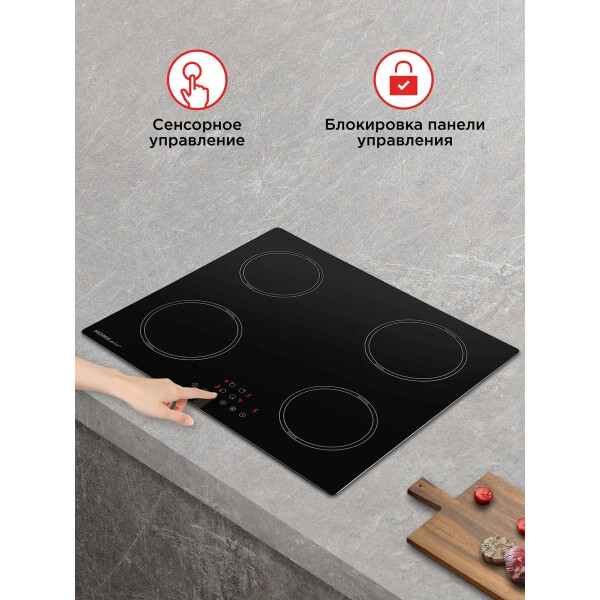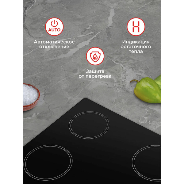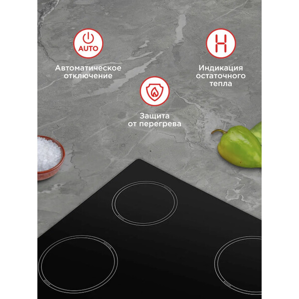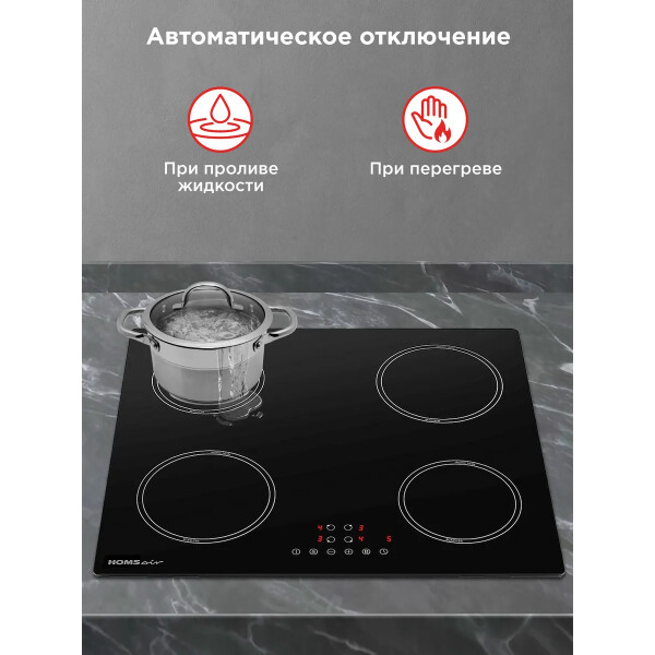 Защитное автоотключение обеспечивает самостоятельное отключение конфорки в случае перегрева или попадания воды, это гарантирует высокую степень безопасности для вас и вашего дома.