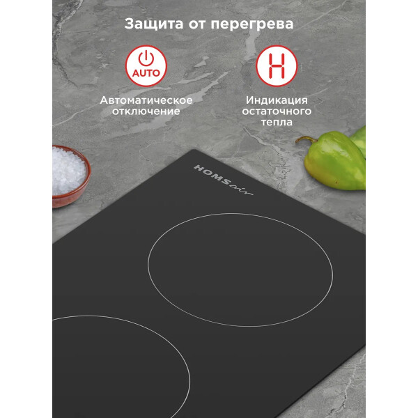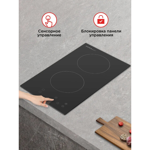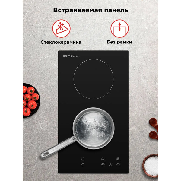 Встраиваемая электрическая варочная панель HOMSair HV32BK является электрической и выполнена из стеклокерамики, что позволяет экономить время для приготовления пищи, а также электроэнергию. Для включения варочной поверхности достаточно одного прикосновения к сенсорным переключателям, с помощью которых можно выбрать необходимую конфорку, а также регулировать мощность нагрева.