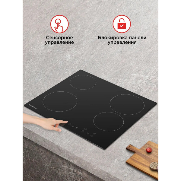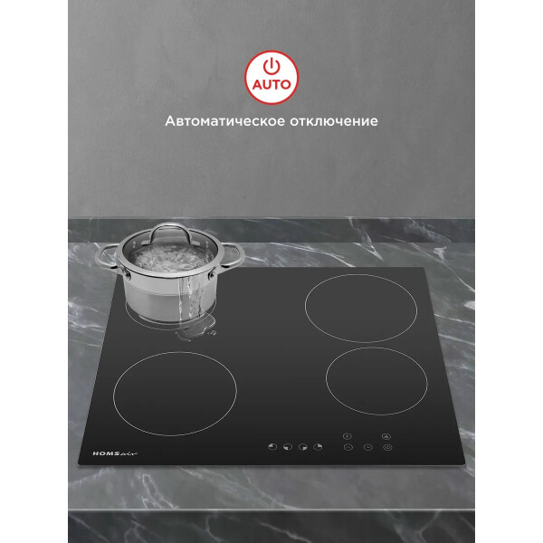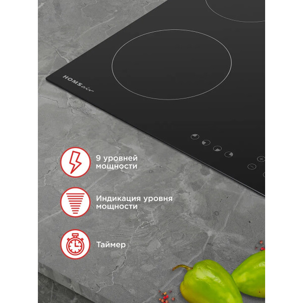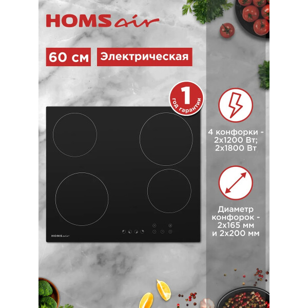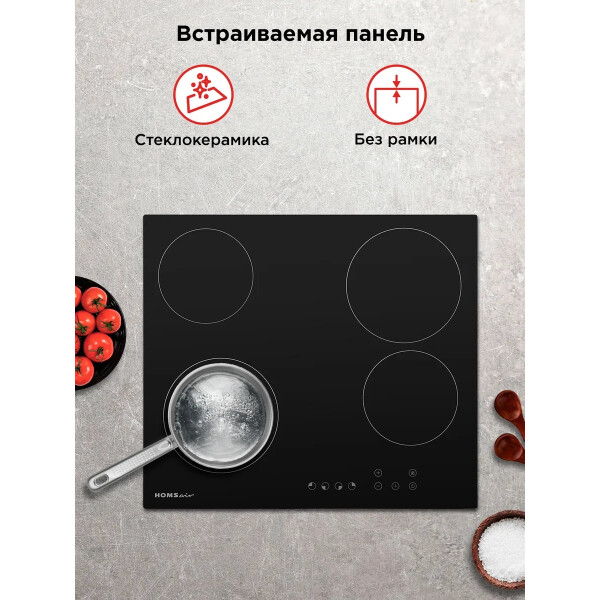 Встраиваемая электрическая варочная панель HOMSair HV64BK является электрической и выполнена из стеклокерамики, что позволяет экономить время для приготовления пищи, а также электроэнергию. Для включения варочной поверхности достаточно одного прикосновения к сенсорным переключателям, с помощью которых можно выбрать необходимую конфорку, а также регулировать мощность нагрева.